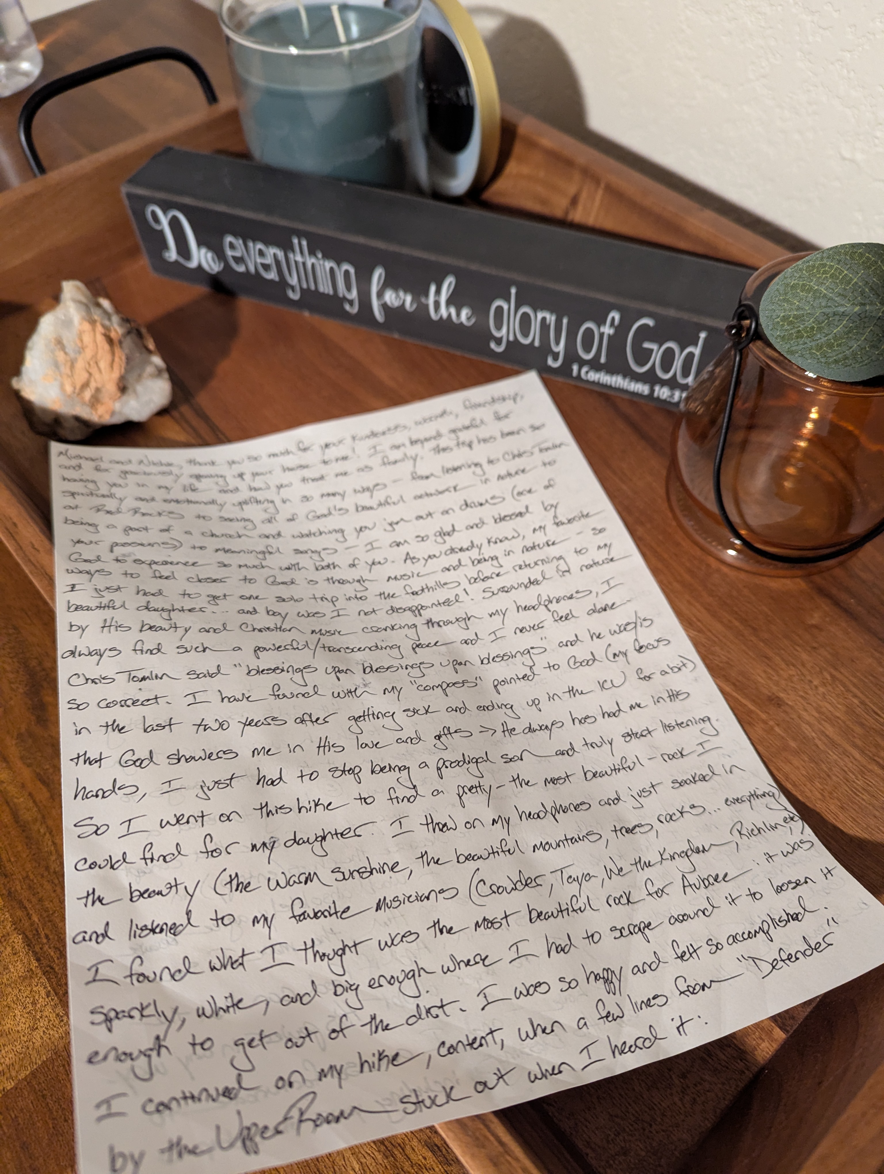I found what I thought was the most beautiful rock for Aubree: it was sparkly, white, and big enough where I had to scrape around it to loosen it enough to get out of the dirt. I was so happy and felt so accomplished. I continued on my hike, content, when a few lines from “Defender” by the UPPERROOM stuck out when I heard it: “You know before I do / Where my heart can seek to find Your truth / Your mercy is the shade I’m living in / You restore my faith and hope again…so much better Your way.” So I continued climbing higher and enjoying the praise music when my eyes caught sight of the most beautiful and unique rock I have ever seen (seriously) – just laying a little ways “off the path.” Not wanting to be greedy, I returned the original rock I had selected for my daughter and was stunned that the rock I had originally picked for Aubree (still beautiful and shiny) was nowhere nearly as beautiful as the rock God eventually led me to on this hike…and it was effortless to pick up! I don’t question God’s love or existence even for one second, because even through trials such as getting sick or going through a nasty divorce, I now see God was never absent, I unfortunately distanced myself from Him after my mother died and tried for decades to feel numb by drinking too much, far too often. So, after I got “really sick” [from pneumonia] a few years ago, I felt God’s presence so strong – way stronger than as a child growing up going to church every week, through two things: 1) actively listening when I jam out to Christian songs to see what God is saying through the lyrics and 2) trying to reflect a fraction of the Light/Love God showers on me every day. I stole that concept from someone who said that if you want to decrease the chaos (entropy) in your life, you have to reflect God’s love. I would absolutely agree because lately the more I try to keep my eyes fixed on Him, the more I see the blessings upon blessings He showers me in. And if God can heal the brokenness in this prodigal son, I no longer doubt His power in any way. God is power but He is also love – and I am so fortunate to be surrounded by His love and His blessings, including your friendship 🙂